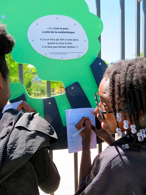 Durant 8 mois, nous nous sommes rendus dans les quartiers du Petit-Colombes et des Fossés-Jean à Colombes, ainsi que dans le quartier du Parc à Nanterre pour récolter auprès des habitant·es anecdotes, ressentis et histoires sur leur ville. De là sont nés plusieurs parcours de signalétiques (les lieux phares, les espaces de jeux, la ville du futur, loisirs et passe-temps, les oiseaux…) que les participant·es ont fabriqués de A à Z.