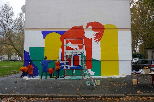 A la suite de nombreux temps de chantiers participatifs pour faire ce projet, nous avons réalisé avec les habitant·es une fresque murale (de 8 m x 4,50 m) qui habille la cité Sellier.