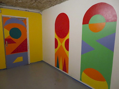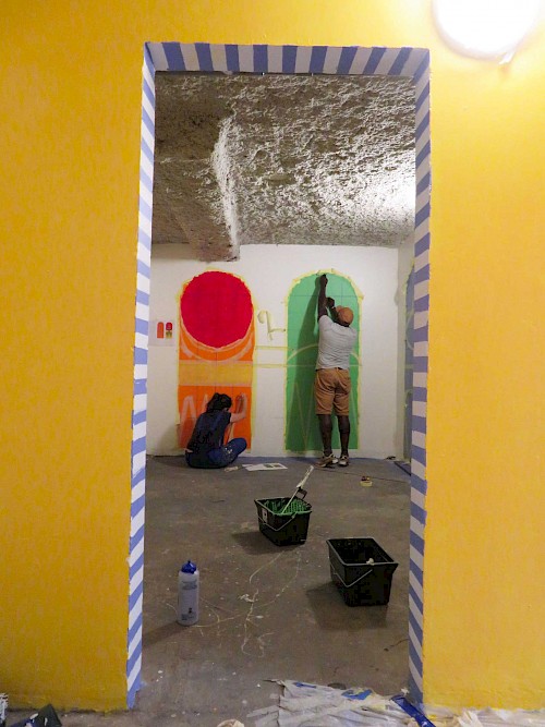 Des ateliers ont été mis en place tout au long du chantier portant sur la recherche esthétique et plastique, l’étude de la technique, la pose du système graphique et la mise en peinture de la fresque.