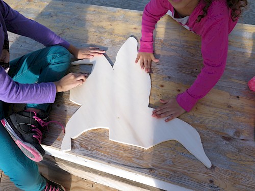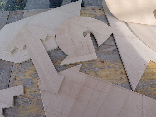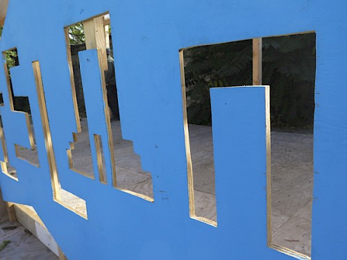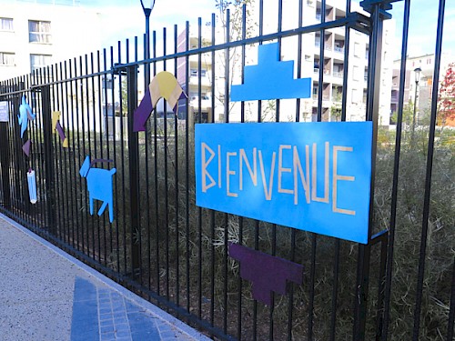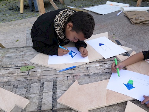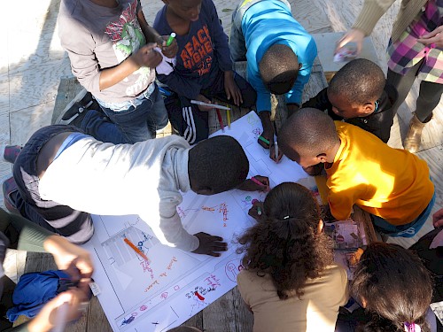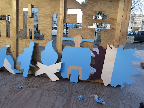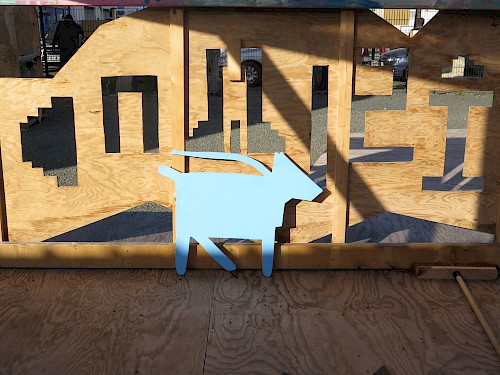 Espace pour signaler et intriguer. Création et réalisation d'une signalétique au sein de la plateforme conçue par les architectes YA+K. Mise en place d'ateliers participatifs pour la création d'une signalétique collaborative sur la place avec les enfants de la Maison de Quartier Roser.