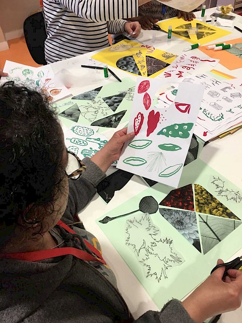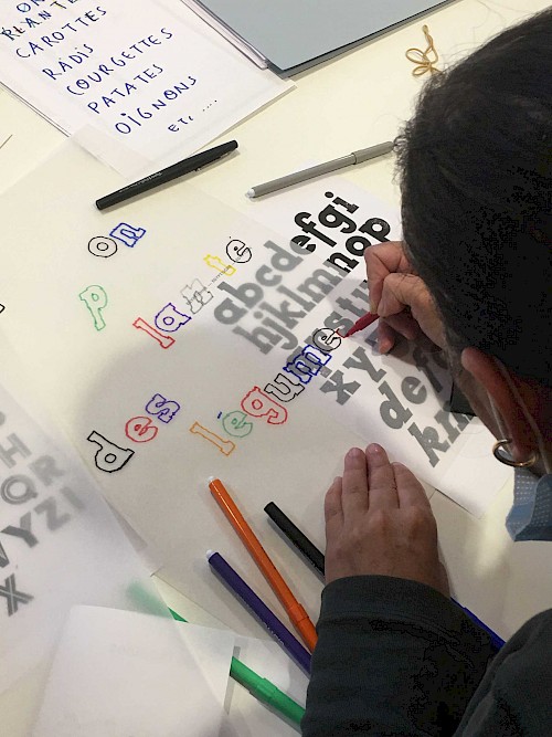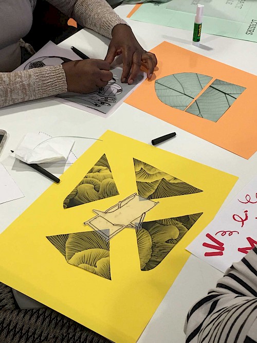 Ces ateliers étaient axés sur la volonté de créer une narration pensée par les participant·es pour signaler les 5 espaces du jardin. Les ateliers se sont déroulés sur 4 temps de composition et de conception à travers la création d’affiches, de blasons et de slogans.