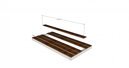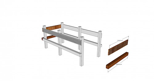 L’ensemble des matériaux sont issus d’une démarche de réemploi en nettoyant et en transformant des chevrons et des planches de terrasse pour constituer l’ensemble du mobilier.