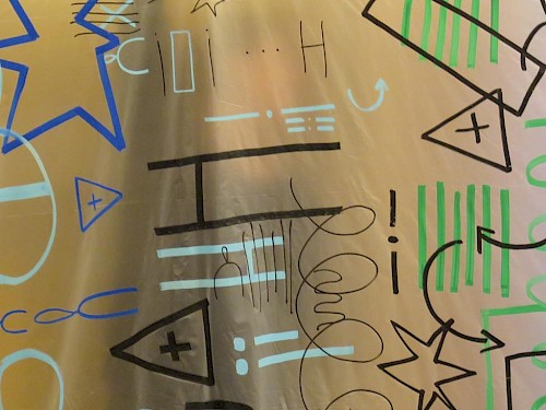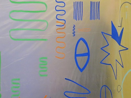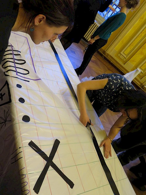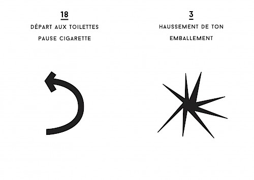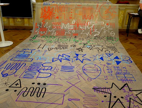 Au moyen d’un dictionnaire de signes créé pour la conférence, nous avons ainsi pu répercuter en direct tout au long de la soirée ces symboles sur un rouleau plastique de 12m, exposé en fin d’événement dans la salle plénière, et permettant de retracer temporellement les épisodes humains ou annexes des débats.