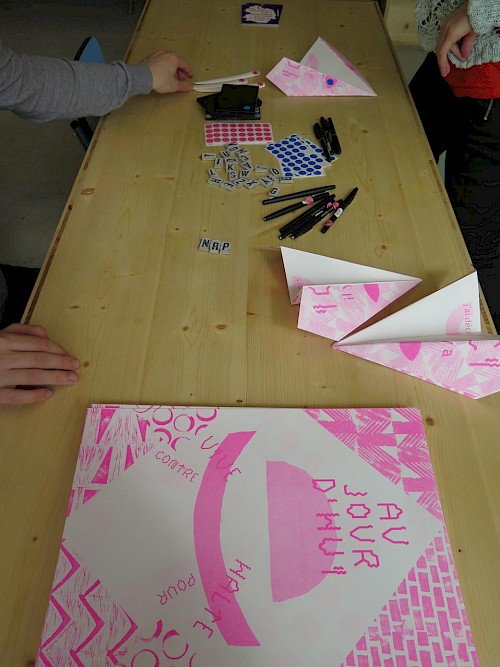 Selon une maquette d’avion, les affiches - avion créées ont été affichées et "étendues" sur les vitrines, les murs mais aussi lancées dans la rue. Ces missi/v/l/es étaient le fruit des voix vives des habitants pour investir l’espace public.