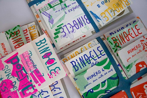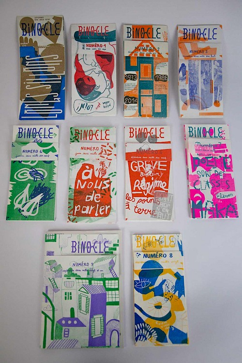 3 - Restitutions et diffusions : Lors de plusieurs temps festifs dans les lieux phares du quartier, nous donnons à découvrir et à lire l'objet imprimé pour échanger et partager un temps commun. Binocle est aussi diffusé sur tout le quartier : lieux ressources et commerces, halls d’immeubles, main à la main…