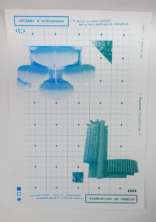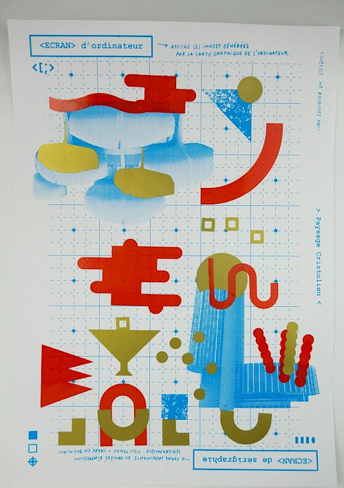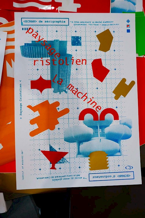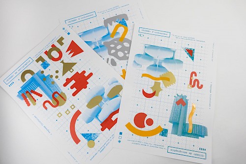 d’impression de formes graphiques sur des cartes postales et affiche a2, dont les visuels avaient été réalisés par notre collectif.