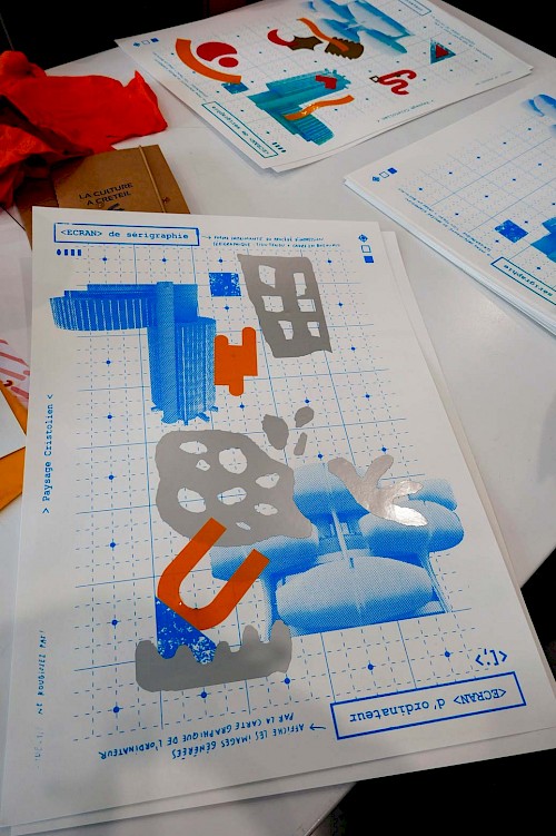 d’impression de formes graphiques sur des cartes postales et affiche a2, dont les visuels avaient été réalisés par notre collectif.