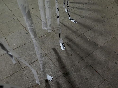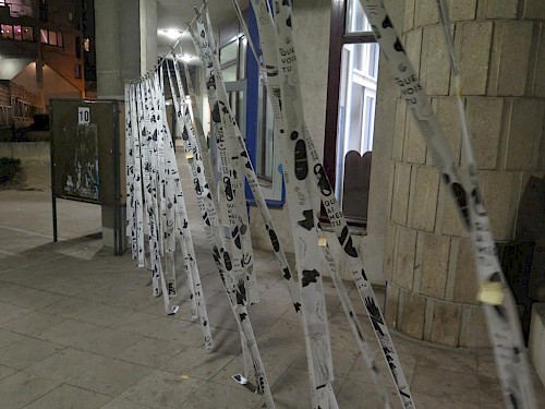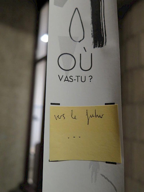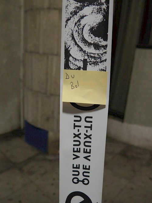 Au moyen de fils tendus en hauteur, des bandelettes de papier réalisées à l'imprimante thermique ont été suspendues les unes à côté des autres, comportant des interventions graphiques imprimées au préalable. Celles-ci posent des questions personnelles aux passants, qui peuvent y répondre en annotant leur intervention sur un post-it à placer ensuite le long de ces bandes.