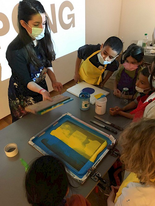 Ces affiches-livrets seront le support pour composer une image grâce à une superposition de formes imprimées en sérigraphie. Les objectifs reposent sur l’envie de sensibiliser un jeune public à des pratiques artistiques; d’appréhender