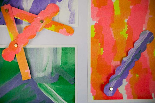 Aussi,ces ateliers ont permis une typographie ludique et des formes graphiques pour un journal d’école maternelle : plus de 36 lettres originales ont été fabriquées ; 238 formes graphiques découpées et assemblées et 34 paysages-collages réalisées.