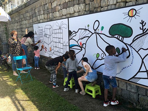 Dans le cadre de l'événement “Ô Berges d’été” à Massy, notre collectif est intervenu lors du premier week-end d’ouverture pour proposer un atelier créatif autour d’une grande fresque participative de 3 panneaux (ville, paysage et portraits).