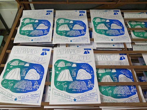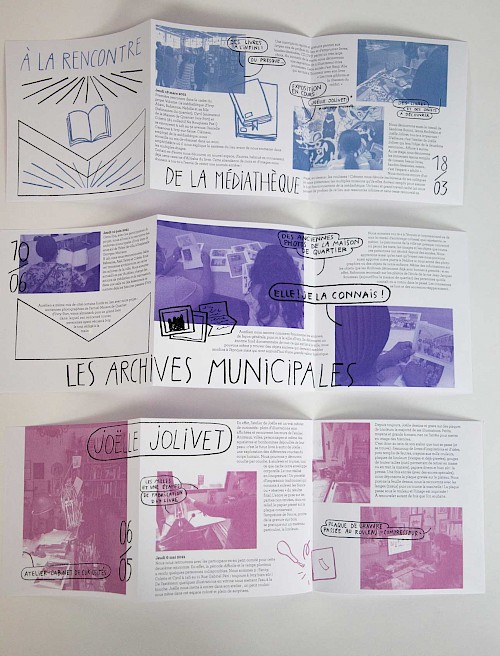 Au total, nous avons mené 6 ateliers de création : d’écriture, d’interviews et de créations graphiques (linogravure, typographie, illustration, mise en page…); 3 rencontres avec des professionnel·les du livre (une illustratrice, une médiathèque et un centre archives), 3 jours de chantier de construction pour le “chariot colporteur” et 1 restitution festive à la Librairie Envie de Lire réunissant tous les partenaires / participant·es du projet.