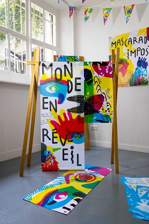 « Masqué·es mais pas bâillonné·es ». Ce projet s’inscrit dans le contexte particulier post-confinement dû à la covid-19, c’est pour cela que nous avons voulu concevoir une identité graphique festive autour du carnaval, des masques et des oiseaux exotiques.