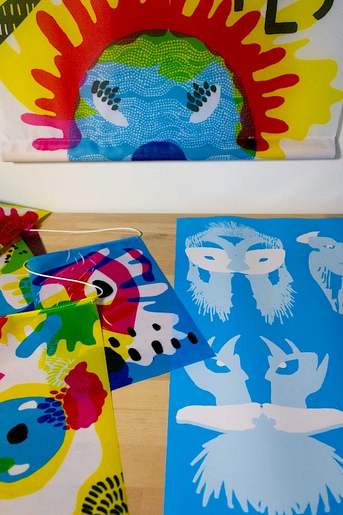De nombreux objets scénographiques ont été produits comme des Kakémonos en tissu (Format 160 x 60 cm), des éco bâches fines (format 120 x 50 cm et 200 x 100 cm), des vitrophanies (format 120 x 150 cm), des guirlandes de fanions (1 format rectangle et 1 format triangle) ainsi qu’une affiche (format 60 x 40 cm) à composer avec une planche stickers autocollants.