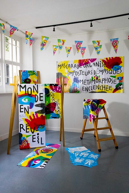 « Masqué·es mais pas bâillonné·es ». Ce projet s’inscrit dans le contexte particulier post-confinement dû à la covid-19, c’est pour cela que nous avons voulu concevoir une identité graphique festive autour du carnaval, des masques et des oiseaux exotiques.