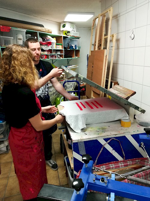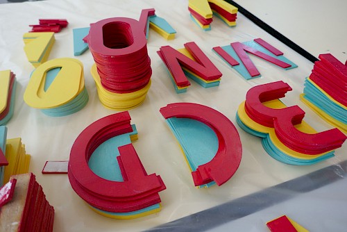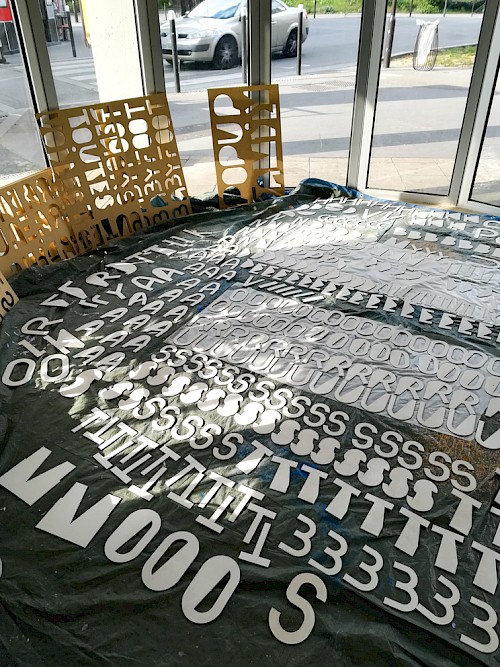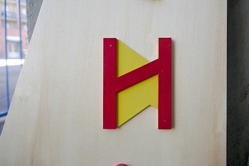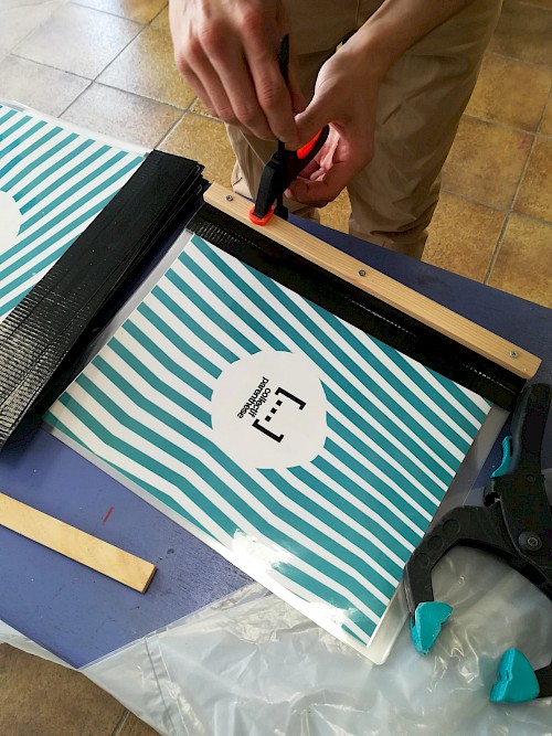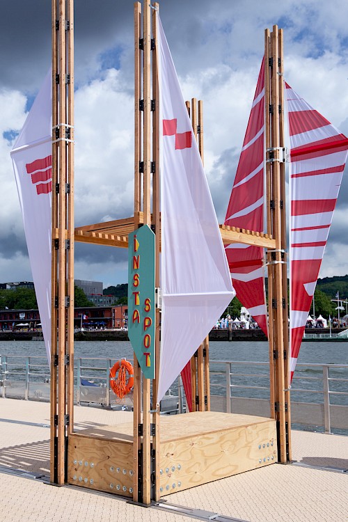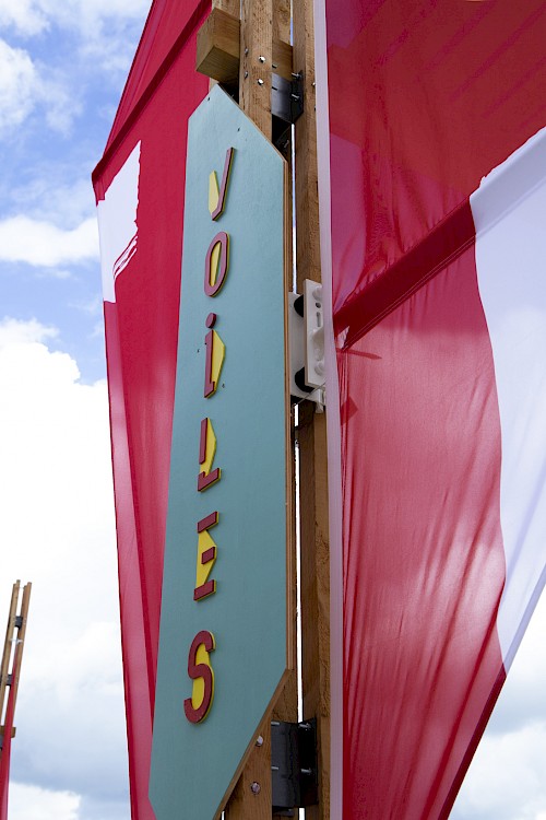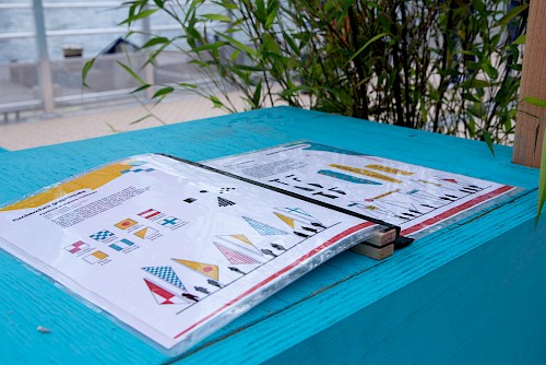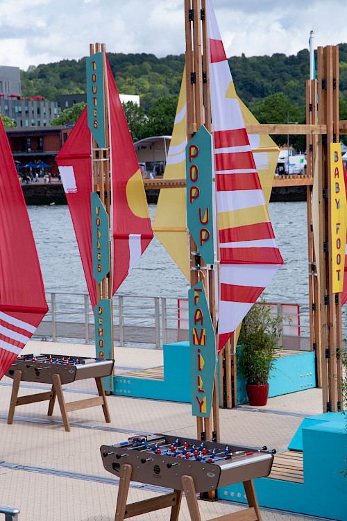 Pour ce projet, le collectif NRP! a réalisé et décliné le graphisme des voiles, en s’inspirant de l’univers des signaux et pavillons maritimes, ainsi qu’une signalétique en bois. Pour cette signalétique, une typographie a été créée, reprenant le système d’un mât de bateau et d’une voile pour chaque caractère. Enfin, une série de goodies aux couleurs de l’installation a été conçue : cendriers, badges, casquettes et t-shirts imprimés en sérigraphie.