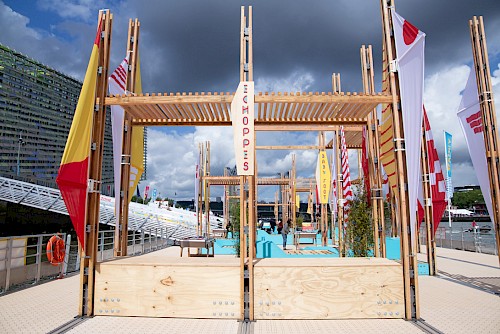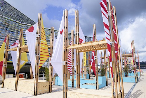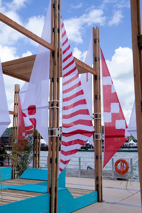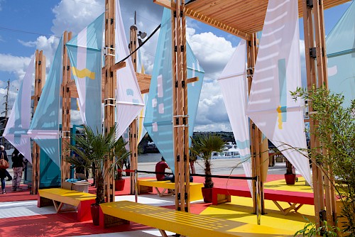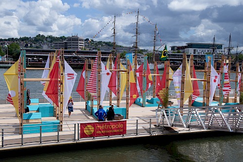 Toutes Voiles Dehors est un projet pensé et conçu par le collectif d’architectes Parenthèse, dans la cadre de l’Armada de Rouen, en 2019. Ils ont imaginé une installation composée de mobiliers urbains et de voiles (drapeaux) pour offrir au public de l’Armada un espace de détente et de jeu, sur une barge flottante.