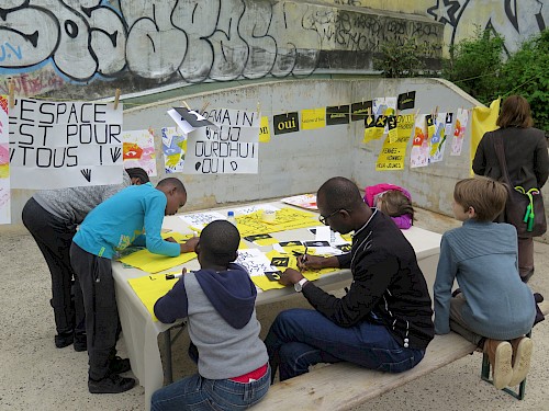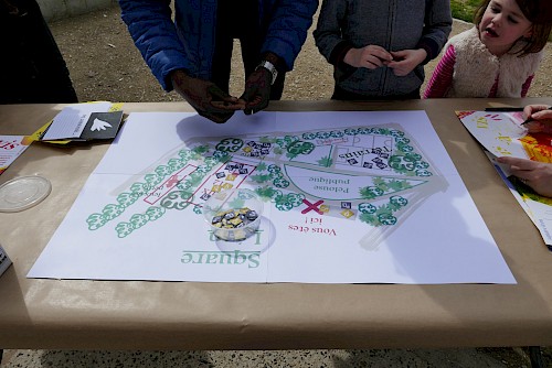 Durant 3 demies journées le collectif est venu interroger les usagers du square Léon sur leur rapport au genre dans l’espace public. A l’aide d’un mini-jeu de plateau et d’affiches interrogatives les participants témoignaient de leur passage et usage de cet espace voué à évoluer dans les prochaines années.