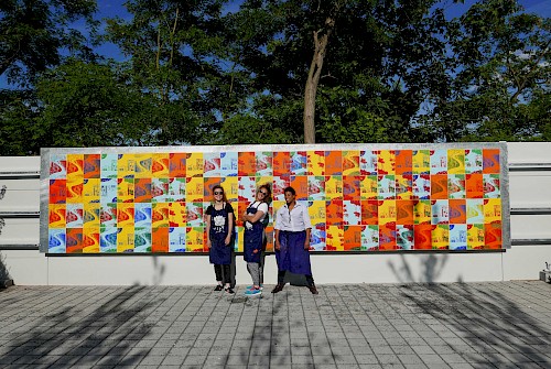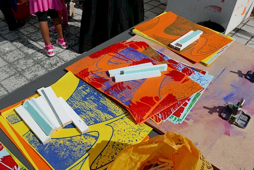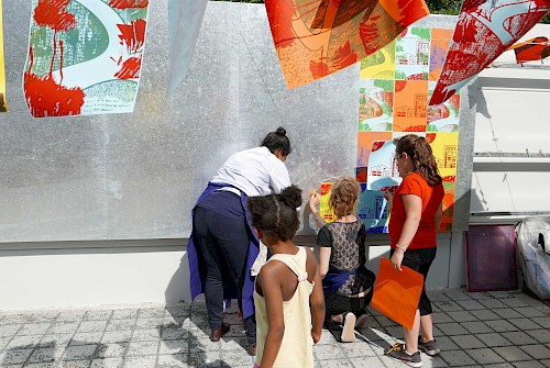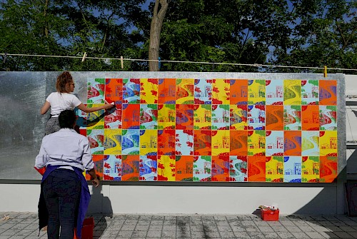 A partir de bases graphiques permettant de se relier les unes aux autres, nous avons sérigraphié les affiches avec le public avant de les coller sous forme de mosaique.