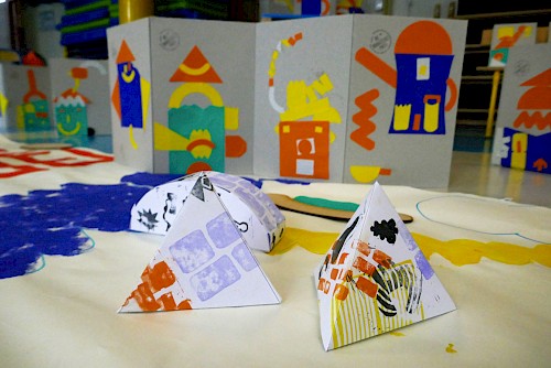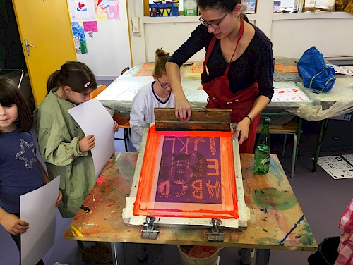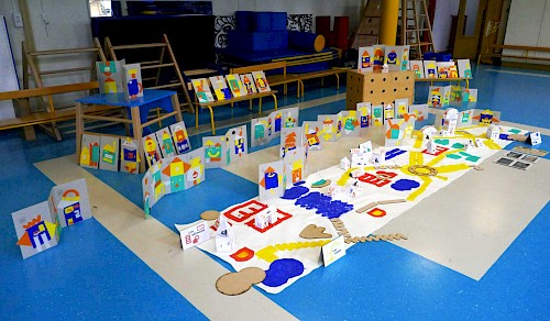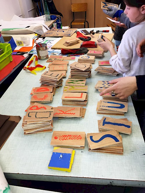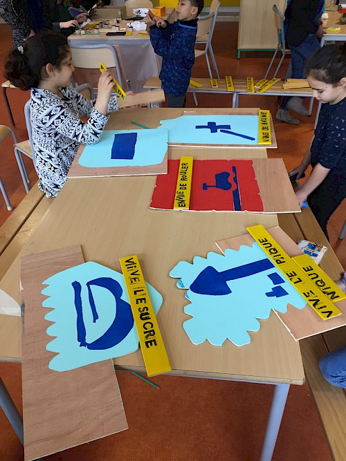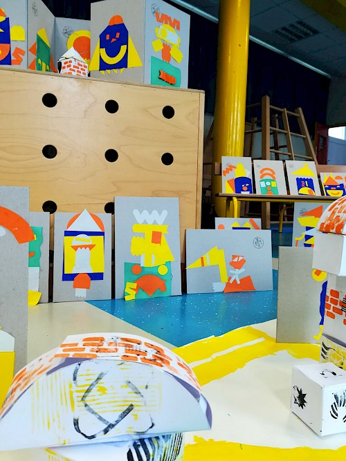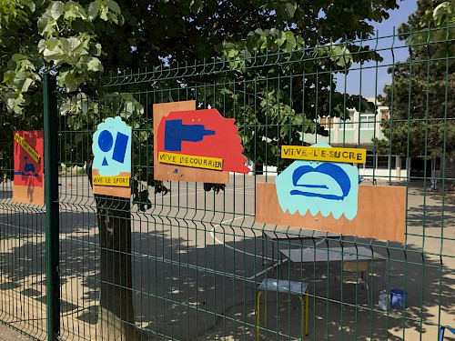 Les CP et CE1 de l’école Tailhan se sont mis à la scie à chantourner pour construire une nouvelle signalétique poétique qu’ils ont imaginé eux-même sur les grilles de leur école. Les CE2 de l’école Deloges ont pratiqué la typographie et la sérigraphie pour exposer leurs écrits d’une ville volubile dans la cours de récré. Au Centre de loisir Wallon et à la Maison de quartier Gérard Philipe, les enfants ont réalisé des drapeaux à scander des onomatopées dans les rues. Les Maternelles de l’école Morère ont imaginé une maquette de la ville de Palaiseau en retraçant les chemins et les cours d’eau, bâtissant les immeubles et le centre-ville et en proposant des maisons - farfelues. Les usagers du Parvis Multisport ont complété des tracts pour fait l’état des lieux du quartier Opéra à Massy. Un peu plus loin, le kiosque du quartier de la Villaine s’est vu habillé d’enseignes par les personnes du Centre social APMV afin de trouver un nom à cette place. L’ensemble de ces fabrications s’est découpé en de nombreux ateliers implicatifs dans une démarche de création artistique, éducative et citoyenne.