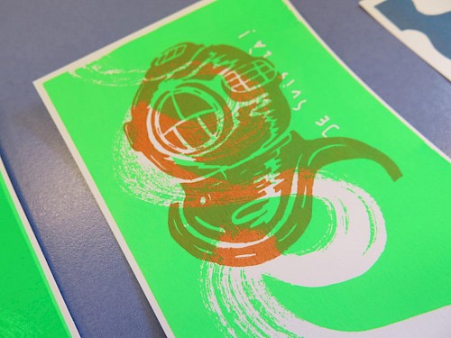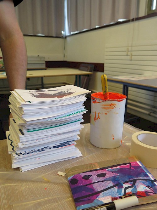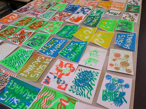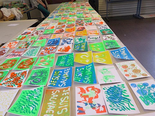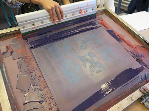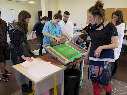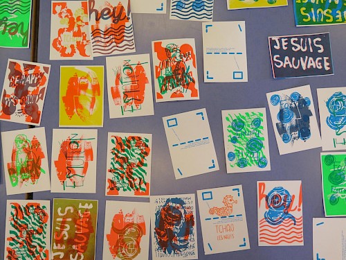 À travers des combinaisons de formes et de sens, les étudiants ont été sensibilisés au medium d’impression de la sérigraphie et de l’aléatoire. Ils ont été invités à détourner un médium dit sériel pour fabriquer des objets uniques par la combinaison et la superposition des couches et des couleurs.