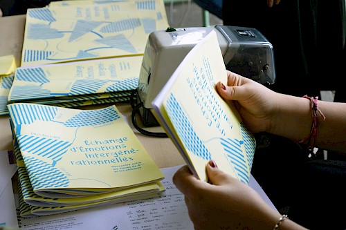 Ces créations ont été restituées sous forme de livre agraphé lors d’une journée festive au collège le 18 juin 2016, les couvertures ont alors été sérigraphiées par tous et 50 livrets façonnés.