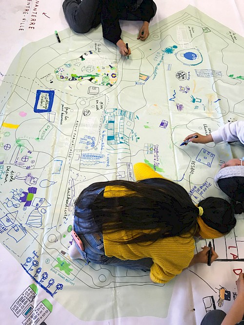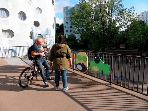 Durant 8 mois, nous nous sommes rendus dans les quartiers du Petit-Colombes et des Fossés-Jean à Colombes, ainsi que dans le quartier du Parc à Nanterre pour récolter auprès des habitant·es anecdotes, ressentis et histoires sur leur ville. De là sont nés plusieurs parcours de signalétiques (les lieux phares, les espaces de jeux, la ville du futur, loisirs et passe-temps, les oiseaux…) que les participant·es ont fabriqués de A à Z.