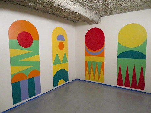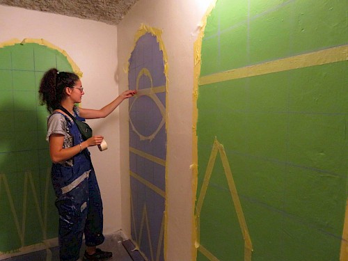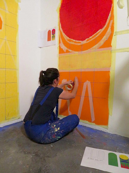 Des ateliers ont été mis en place tout au long du chantier portant sur la recherche esthétique et plastique, l’étude de la technique, la pose du système graphique et la mise en peinture de la fresque.