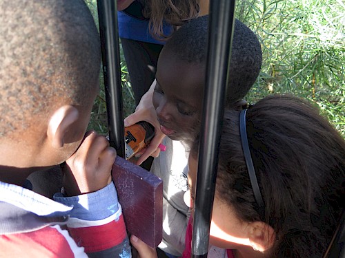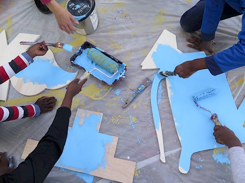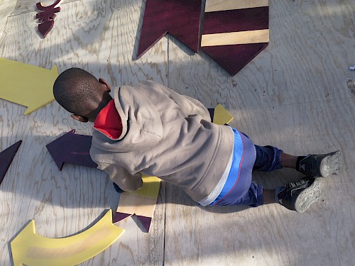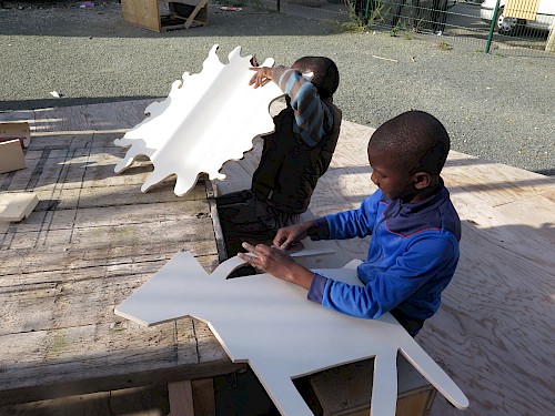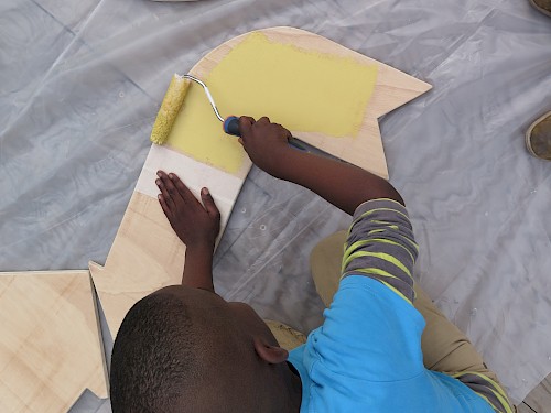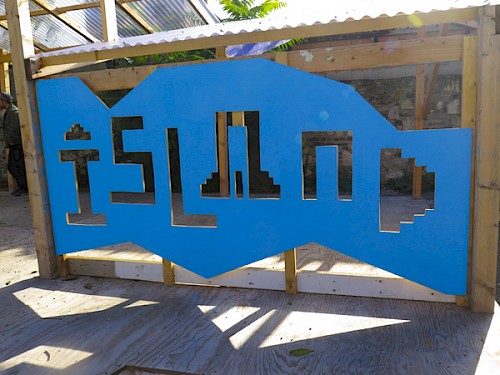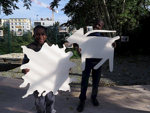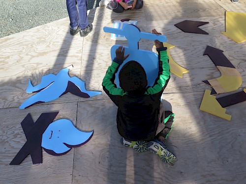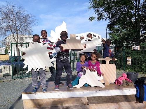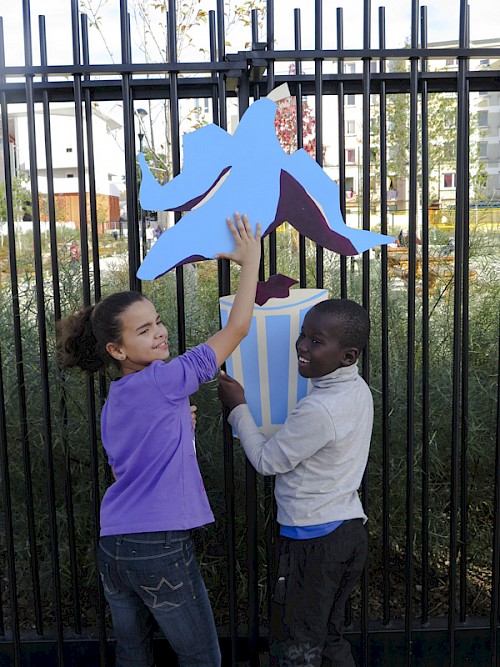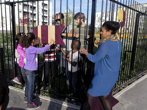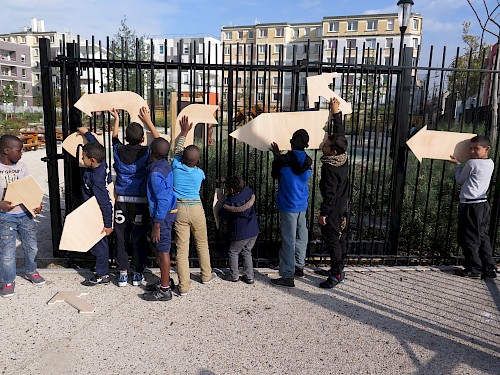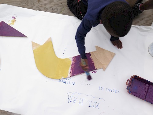 Espace pour signaler et intriguer. Création et réalisation d'une signalétique au sein de la plateforme conçue par les architectes YA+K. Mise en place d'ateliers participatifs pour la création d'une signalétique collaborative sur la place avec les enfants de la Maison de Quartier Roser.