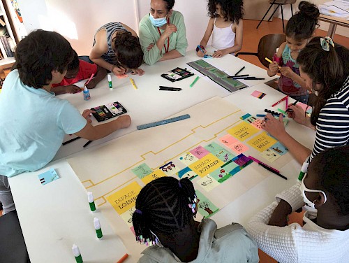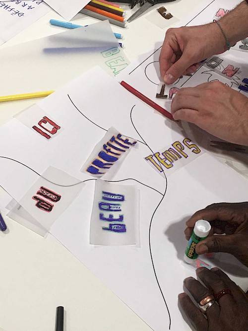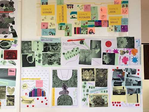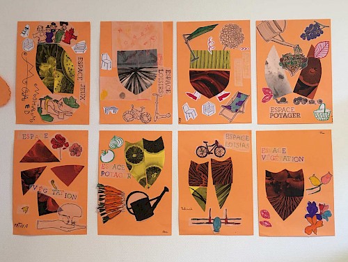 Ces ateliers étaient axés sur la volonté de créer une narration pensée par les participant·es pour signaler les 5 espaces du jardin. Les ateliers se sont déroulés sur 4 temps de composition et de conception à travers la création d’affiches, de blasons et de slogans.