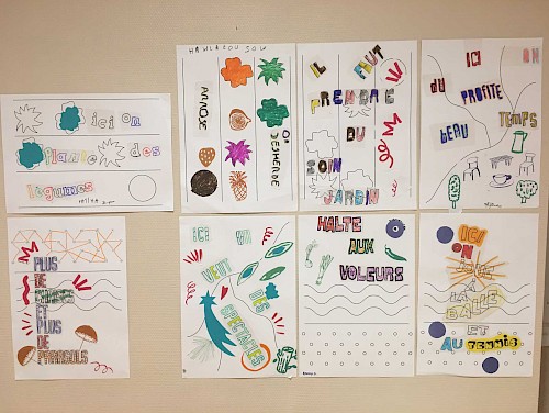 Ces ateliers étaient axés sur la volonté de créer une narration pensée par les participant·es pour signaler les 5 espaces du jardin. Les ateliers se sont déroulés sur 4 temps de composition et de conception à travers la création d’affiches, de blasons et de slogans.