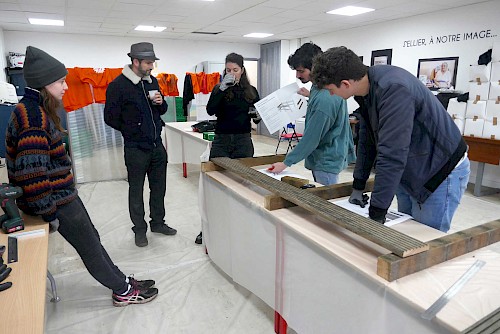 L’ensemble des matériaux sont issus d’une démarche de réemploi en nettoyant et en transformant des chevrons et des planches de terrasse pour constituer l’ensemble du mobilier.