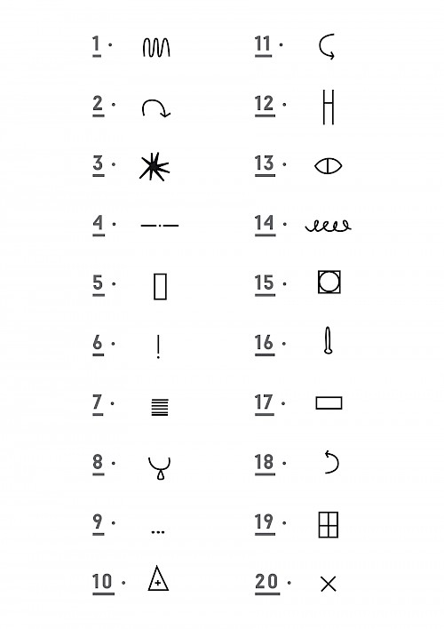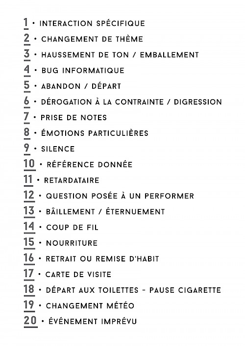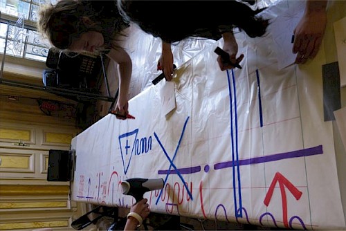 Système : des observateurs notent les anecdotes observées au moyen d'un répertoire de chiffres / une navette récolte ces notes et les amène aux traducteurs / les traducteurs recopient les notes en leur associant le symbole correspondant / les dessinateurs répercutent ces symboles, avec les échelles de taille en fonction de l'importance, sur un rouleau de bâche.