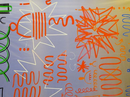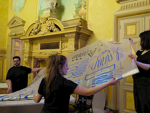 Au moyen d’un dictionnaire de signes créé pour la conférence, nous avons ainsi pu répercuter en direct tout au long de la soirée ces symboles sur un rouleau plastique de 12m, exposé en fin d’événement dans la salle plénière, et permettant de retracer temporellement les épisodes humains ou annexes des débats.