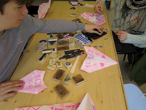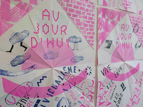 Selon une maquette d’avion, les affiches - avion créées ont été affichées et "étendues" sur les vitrines, les murs mais aussi lancées dans la rue. Ces missi/v/l/es étaient le fruit des voix vives des habitants pour investir l’espace public.