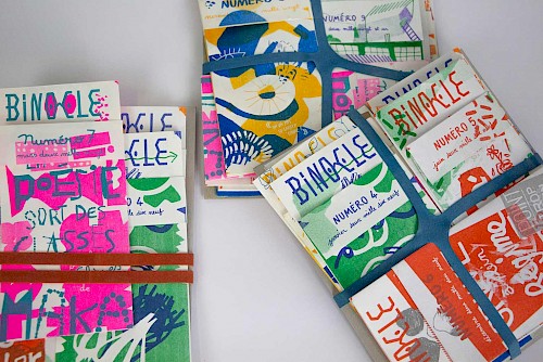 3 - Restitutions et diffusions : Lors de plusieurs temps festifs dans les lieux phares du quartier, nous donnons à découvrir et à lire l'objet imprimé pour échanger et partager un temps commun. Binocle est aussi diffusé sur tout le quartier : lieux ressources et commerces, halls d’immeubles, main à la main…