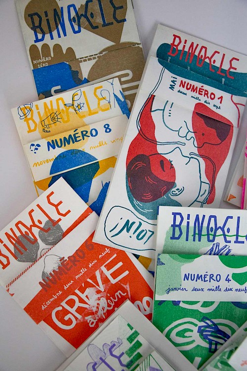 Depuis 2016, nous avons conçu, réalisé et édité “Binocle” qui est la gazette de quartier du Petit-Ivry. Ce journal est né d'une envie collective de notre collectif pour co-écrire et co-créer un objet-témoin de la vie de quartier du Petit-Ivry pour et avec ses habitant.es. Nous avons édité 10 numéros au total entre 2016 et 2021, à travers de nombreuses thématiques et rencontres des différent.es habitant.es et acteurs du territoire.