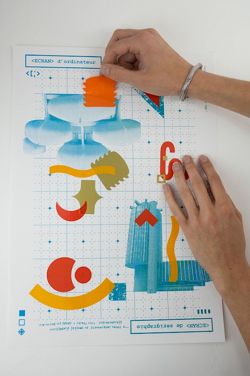 d’impression de formes graphiques sur des cartes postales et affiche a2, dont les visuels avaient été réalisés par notre collectif.