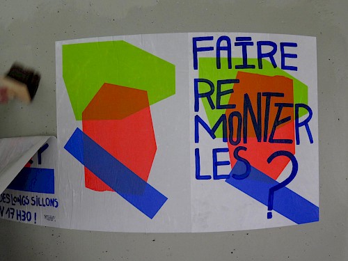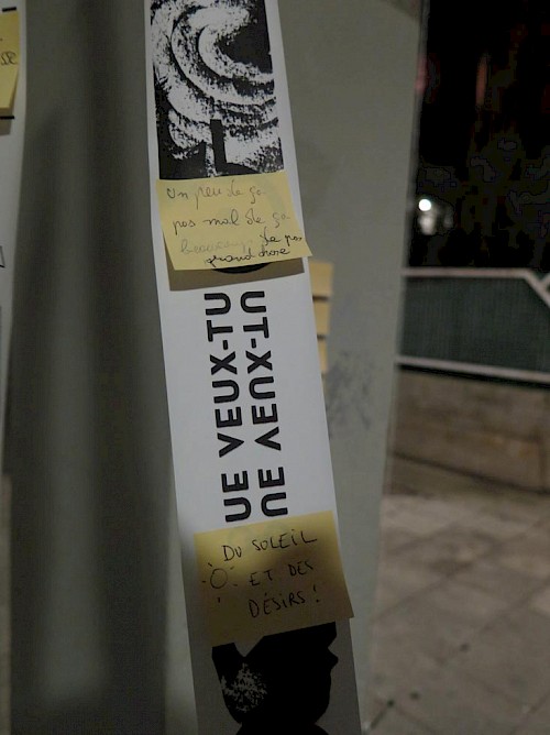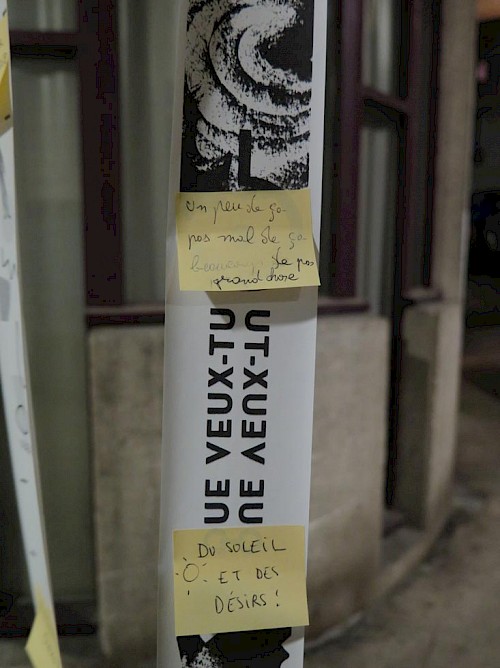 Au moyen de fils tendus en hauteur, des bandelettes de papier réalisées à l'imprimante thermique ont été suspendues les unes à côté des autres, comportant des interventions graphiques imprimées au préalable. Celles-ci posent des questions personnelles aux passants, qui peuvent y répondre en annotant leur intervention sur un post-it à placer ensuite le long de ces bandes.
