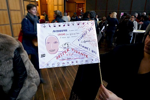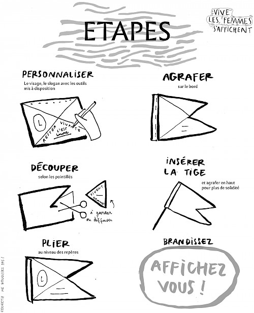 L’atelier les femmes s’affichent propose de créer son drapeau pour brandir un message, un visage, un slogan comme un cri visuel de ralliement. Pour ce faire, le collectif a choisi 9 verbes et 9 traits de caractères. A chaque mot est associé un signe : le but est de choisir un verbe et deux traits de caractère qui inspire pour ensuite les placer sur le visage-blason et pour compléter le slogan.