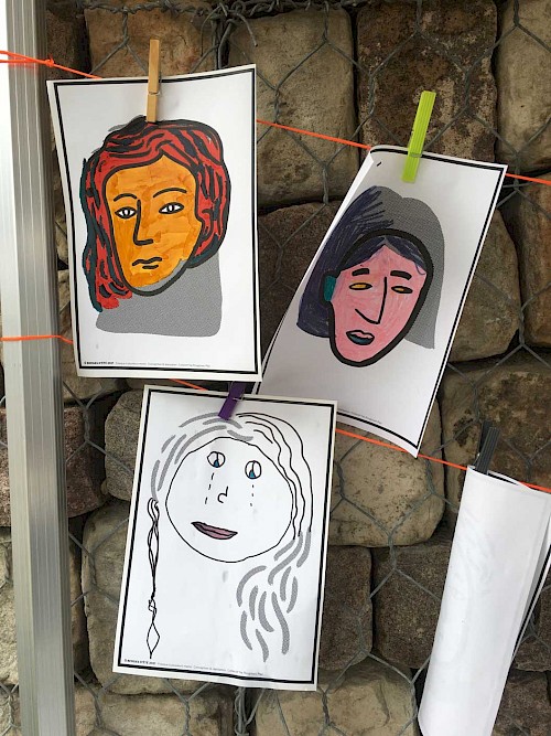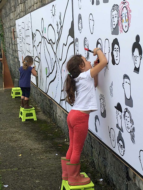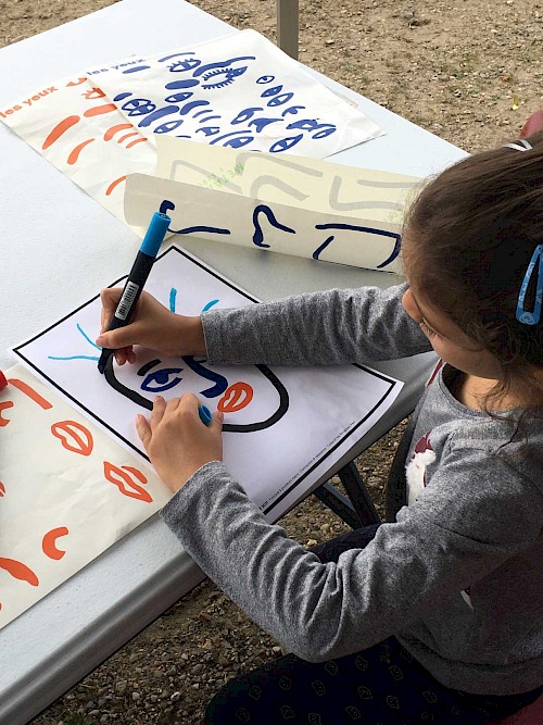Les participant·es étaient invité·es à remplir ces trois fresques, constituant un triptyque, à l’aide de feutres et d'autocollants en vinyle. Un atelier “Galerie de portraits” était aussi activé, en parallèle, pour réaliser un portrait graphique de soi ou d’un·e flâneur·euse de passage, à l’aide de portraits pré-dessinées et/ou de rhodoïdes.
