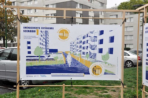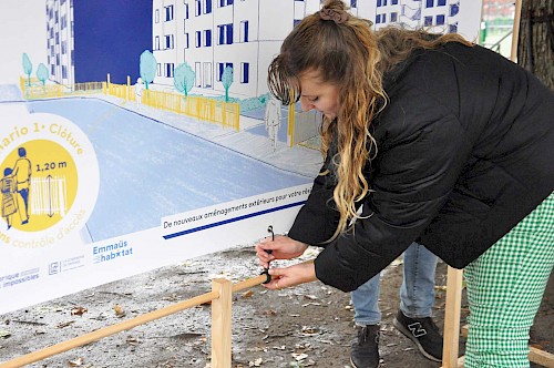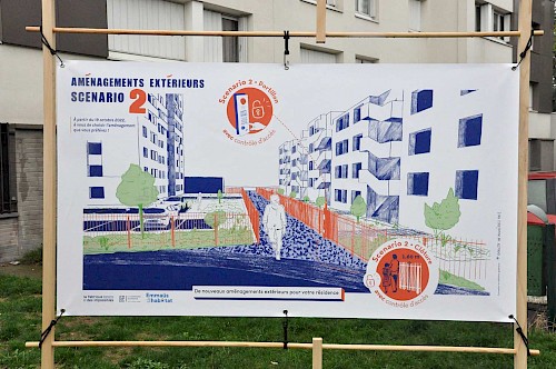 La Fabrique des impossibles et Emmaüs Habitat accompagnent les habitant·es de la cité de l’Europe à Aulnay-sous-bois dans le vote d'un scénario de résidentialisation (aménagement des espaces communs en pied d'immeubles). Pour présenter ces scénarios aux habitant·es, notre collectif a réalisé 8 illustrations de vues architecturales et les supports permettant de les accueillir durant 2 semaines in situ.