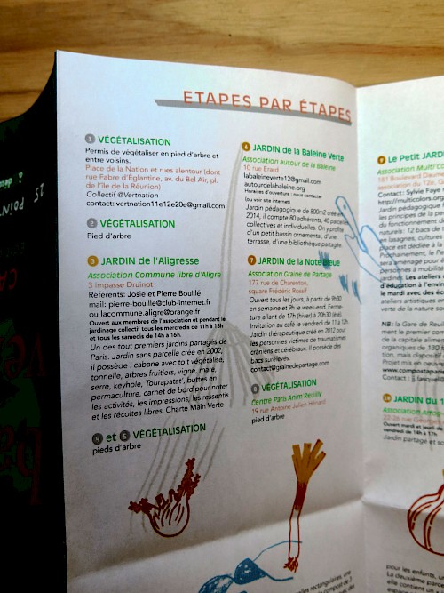 Cette carte est le point névralgique de la promenade dans les jardins puisqu’elle concentre toutes les informations, lieux de rendez-vous, d’échanges et de rencontres potagères du quartier.