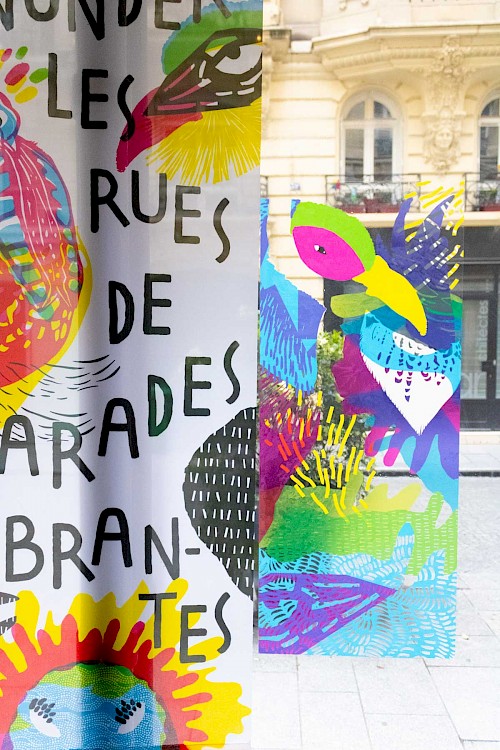 « Masqué·es mais pas bâillonné·es ». Ce projet s’inscrit dans le contexte particulier post-confinement dû à la covid-19, c’est pour cela que nous avons voulu concevoir une identité graphique festive autour du carnaval, des masques et des oiseaux exotiques.