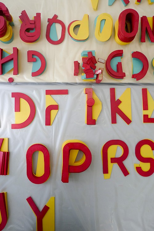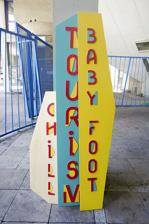 Pour ce projet, le collectif NRP! a réalisé et décliné le graphisme des voiles, en s’inspirant de l’univers des signaux et pavillons maritimes, ainsi qu’une signalétique en bois. Pour cette signalétique, une typographie a été créée, reprenant le système d’un mât de bateau et d’une voile pour chaque caractère. Enfin, une série de goodies aux couleurs de l’installation a été conçue : cendriers, badges, casquettes et t-shirts imprimés en sérigraphie.