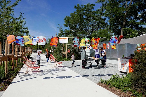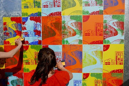 Horizons Urbains est un projet de création participative en sérigraphie d’un espace mural municipal avec les habitants du quartier du Chaperon Vert lors de la fête du quartier, et avec les usagers du Centre Culturel Municipal lors de l’inauguration du festival.
