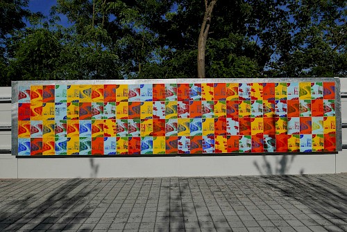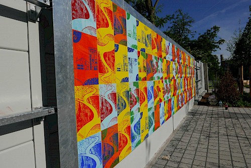 A partir de bases graphiques permettant de se relier les unes aux autres, nous avons sérigraphié les affiches avec le public avant de les coller sous forme de mosaique.