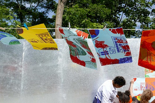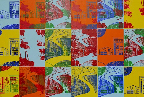 Horizons Urbains est un projet de création participative en sérigraphie d’un espace mural municipal avec les habitants du quartier du Chaperon Vert lors de la fête du quartier, et avec les usagers du Centre Culturel Municipal lors de l’inauguration du festival.