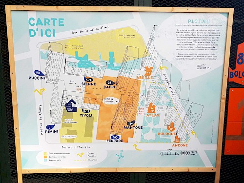 Ce projet de signalétique a démarré en juillet 2017 avec une série de joyeux ateliers dans l’espace public à Villa d’Este, Paris 13. À partir de photographies liées à la cité, nous avons fabriqué des pictogrammes représentant les tours et certains points remarquables, afin de constituer une cartographie représentatif de l’ensemble urbain ainsi que des panneaux directionnels qui l’accompagnent. Ce Protocole d’Interprétation du Territoire en Agglomération Urbaine est l’aboutissement d’un chantier participatif avec des habitants du quartier et le soutien de l’EDL, et de la ville de Paris. Merci au centre social 13 pour Tous pour leur aide précieuse et aux syndicats de copropriétés pour leur autorisation à intervenir sur le territoire.