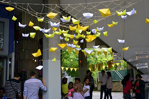 Nous avons apporté quelques jeux pour petits et grands, ainsi qu'un atelier de gazette, mis un peu de musique et quelques guirlandes lumineuses, et invité tout le monde à apporter une petite contribution pour alimenter le buffet.